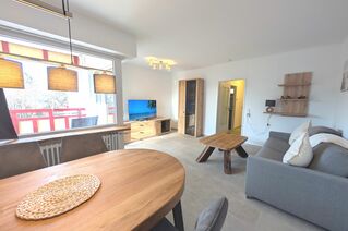Das Appartement besteht aus einem Schlafzimmer mit Etagenbetten, einem Wohnbereich mit ausziehbarem Schlafsofa , eine voll ausgestattete separate Küche , einem Badezimmer mit Dusche sowie WC.